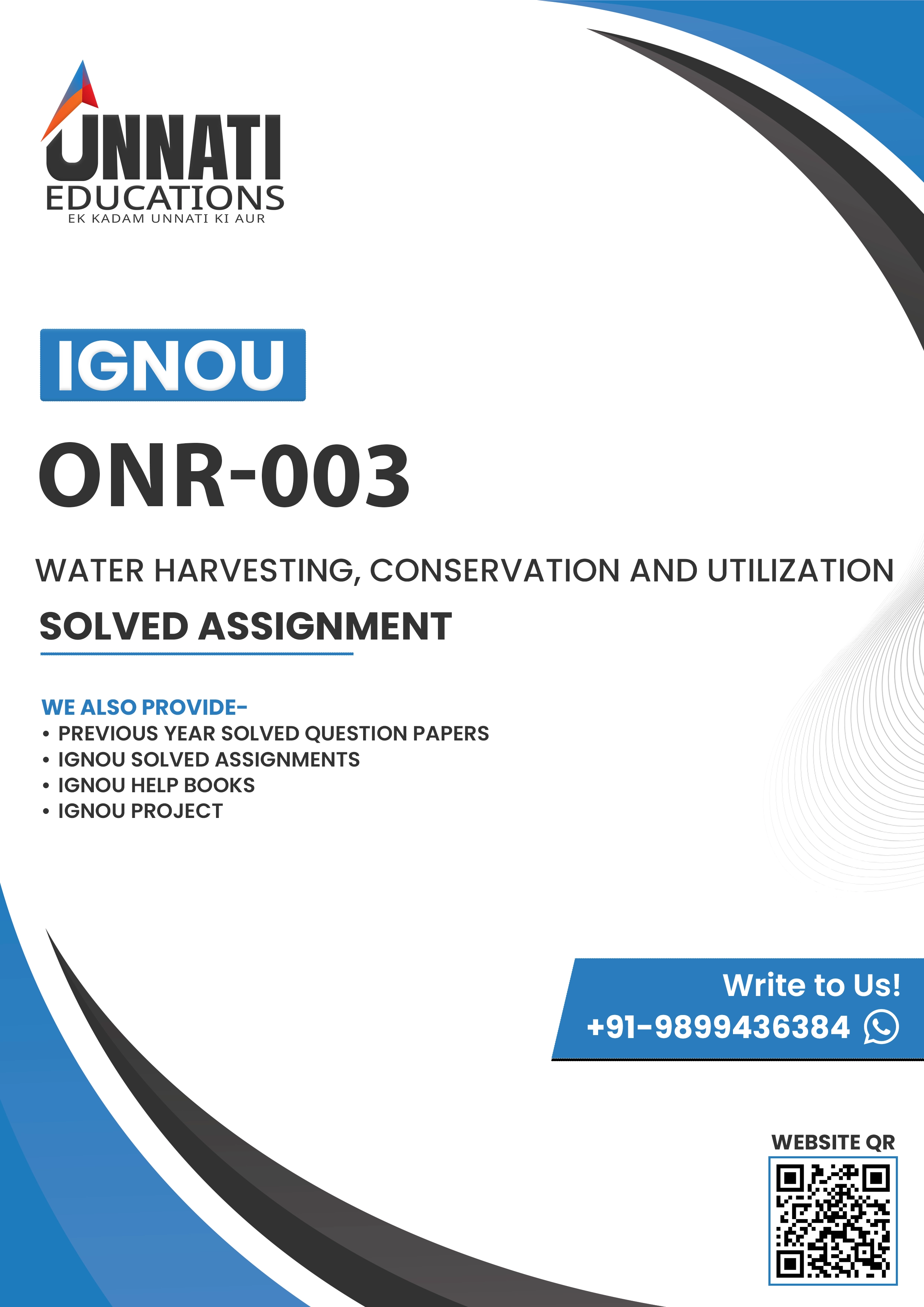 ONR 003 Water Harvesting, Conservation and Utilisation Solved Assignment is specially prepared for students of Certificate in Water Harvesting and Management (CWHM). This assignment solution covers complete answers in simple and clear language as per IGNOU guidelines. Every answer is written in your own words format so you can easily understand, rewrite and score better marks. The content is based strictly on the latest July 2025 and January 2026 session booklet and follows proper structure, word limit and presentation style.