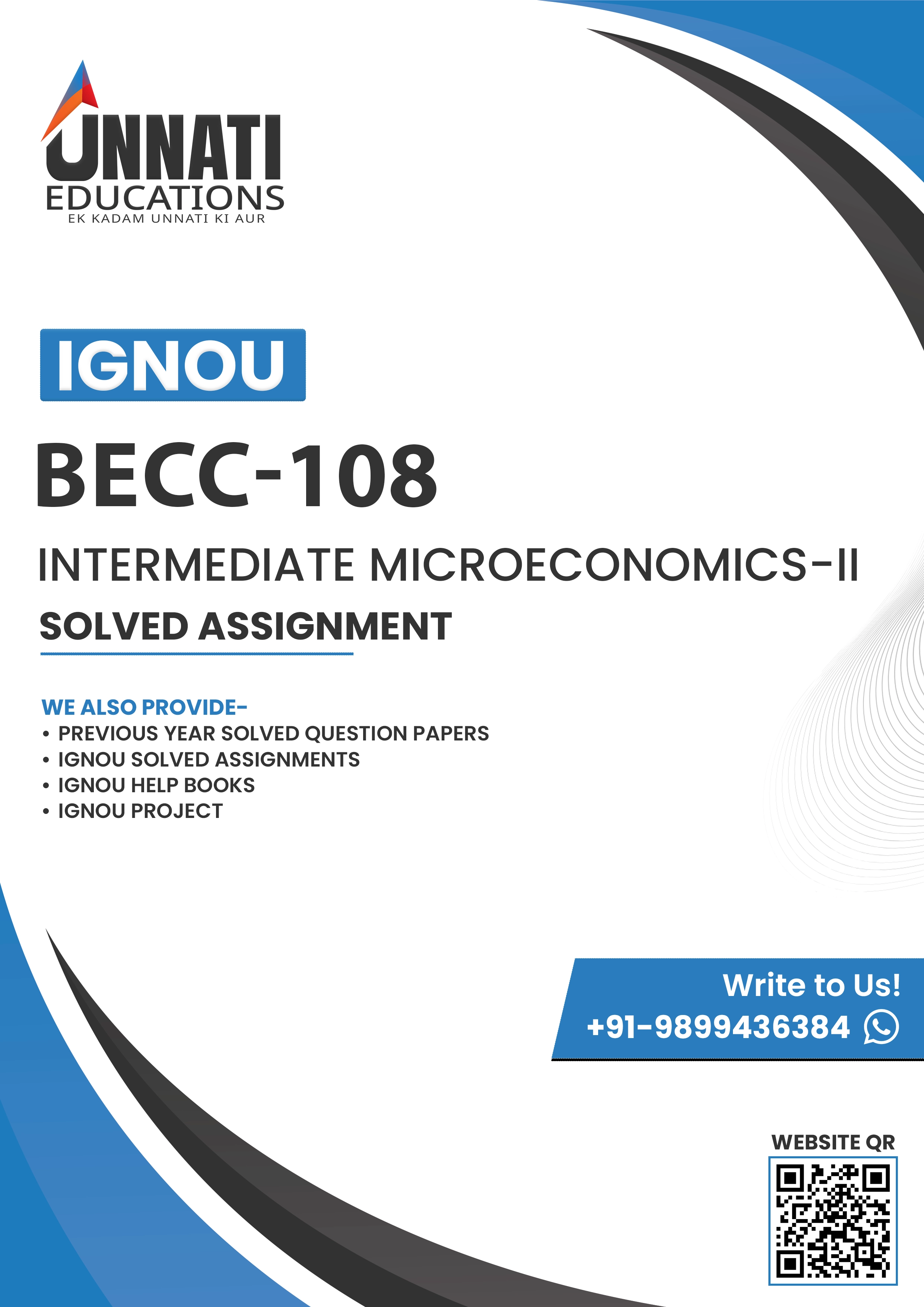 BECC 108 Intermediate Microeconomics-II Solved Assignment is prepared strictly as per the latest IGNOU 2025–26 booklet for BA Economics (Honours). This solution covers monopoly, Cournot and Stackelberg models, Nash equilibrium, signalling, welfare economics, Coase theorem, Pigovian tax and numerical problem solving in a clear and practical manner. Every answer is structured properly with explanation and calculation steps so you can confidently write in your own words and score well. Content is based on the official assignment document and follows the exact question format.