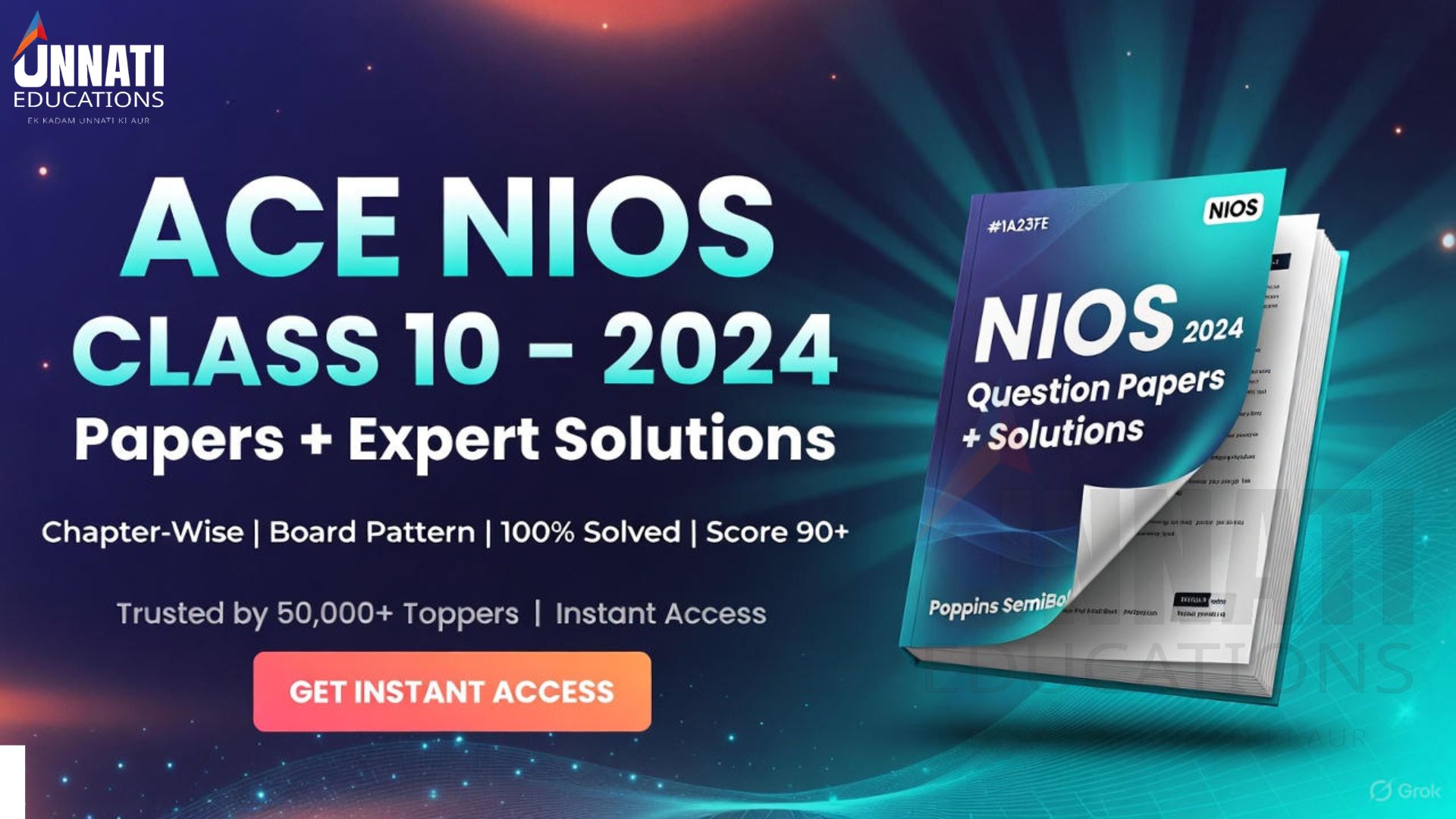 This guide will help you understand how to get the NIOS Class 10 Question Paper with Solution 2024 and how to use it most effectively. This guide will help you understand how to obtain the 2024 Question Paper (with all the answers fully solved), how to best use it, and how Unnati Education can support you in maximizing the benefits of this resource. This is the resource you need if you’re enrolled in Class 10 under the National Institute of Open Schooling board.